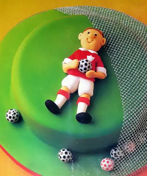 Using the photograph below as a guide, make the footballer's shorts using 22g ( ¾ oz of white sugar paste. Color 45g ( 1½oz ) of sugarpaste red. Using 35g ( 1½oz ), make the red top, smoothing out any ridges. Indent his top at the base to hollow it out and then stick it over the top of the shorts. Model a flattened circle in white sugarpaste and cut c v ' to make a collar. Shape the badge in white sugar paste, cutting the top with the small circle cutter. Roll two white socks, cutting the end of each straight. Remember that you can alter the footballer's colors to suit a favorite team if you want.